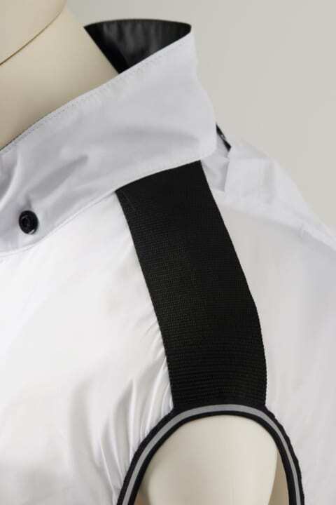 空気の取込みを確保するために、ファンをベスト側面に配置すると共に、体とウェアとの間にしっかりとスペースを設けることができる、専用のスペーサーパッド(特許技術採用)を開発し、背中に何らかの負荷が掛かった状態でもウェア内を風が循環、“バッグを背負っても背中が涼しい”を実現しました。また、デバイスには不良率が驚異的に低く、その安全性と信頼性で空調服(電動ファン付きウェア)市場のシェアトップを走る、株式会社空調服のファンとバッテリーを採用しました。
